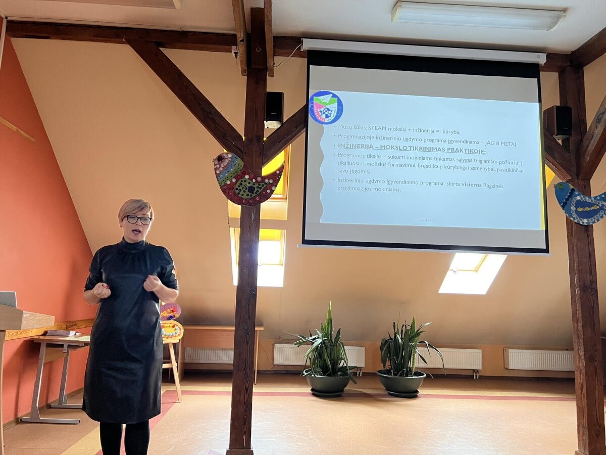 Šiaulių Ragainės progimnazijos inžinerijos mokytoja Ingrida Donelienė pasakojo apie mokinių pasiekimų gerinimą integruojant inžinerinio ugdymo programą įvairių dalykų pamokose, apie matematikos pasiekimų vertinimą atliekant inžinerinius tyrimus ir kūrybines užduotis bei pristatė knygeles „Inžinerija + matematika. Tyrinėk, kurk, pasitikrink“.
